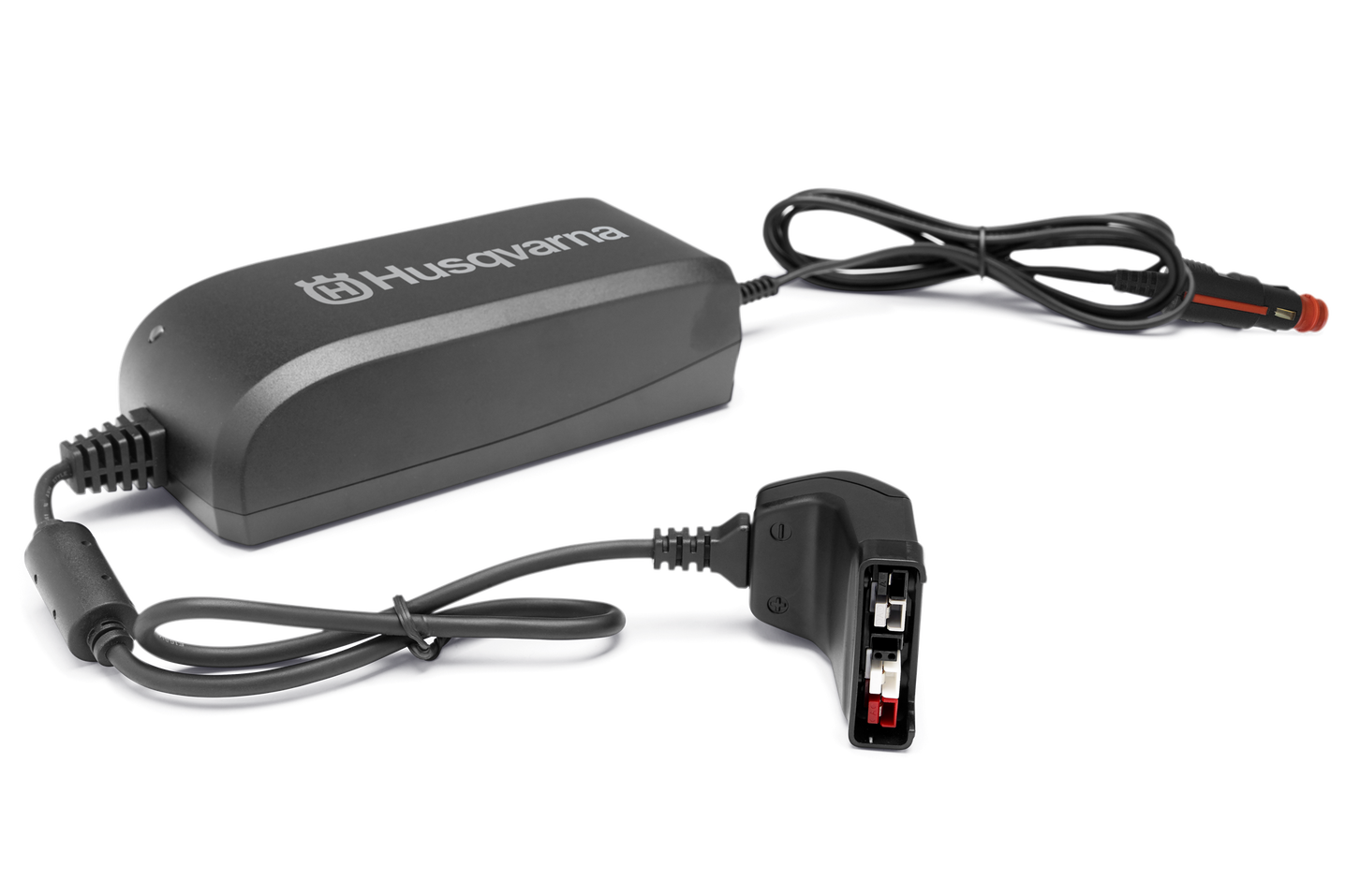 Kompakt Husqvarna akkumulátortöltő 12V-os csatlakozóval. A Li-ion BLi akkumulátorok biztonságos és hatékony töltéséhez autókban.